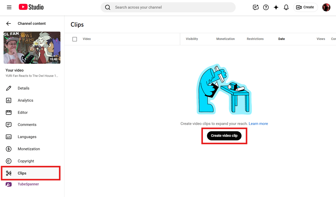 Head over to YouTube Studio on desktop and select a video to go to your Video Details page. Click on "Clips" and then "Create video clip."