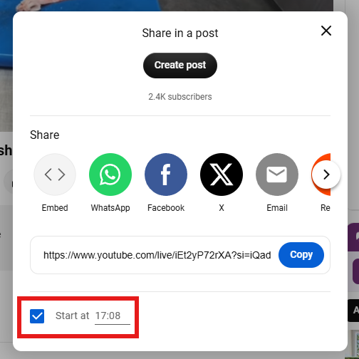 - On desktop, check the box "Start at" and type in the timestamp.
