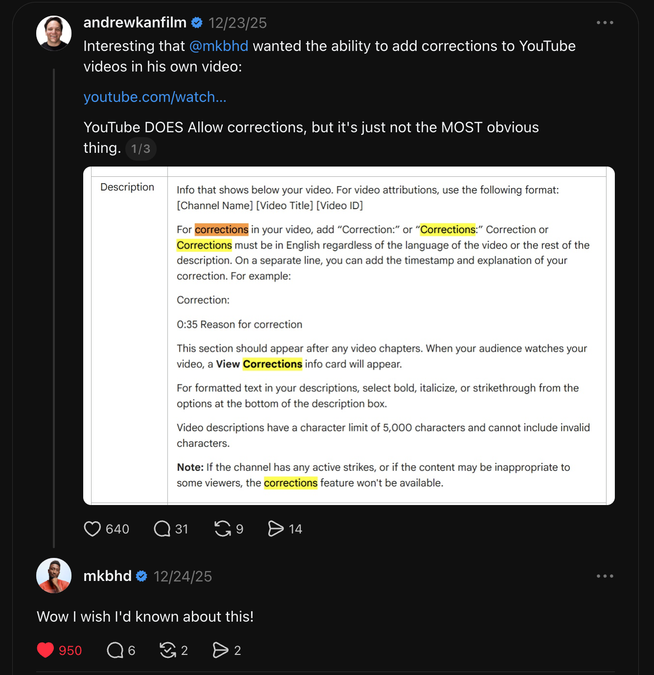 I also saw that Marques Brownlee, better known as MKBHD, wished there was a way in a video to fix things on YouTube, and I thought to tell him about the feature, and HE said: