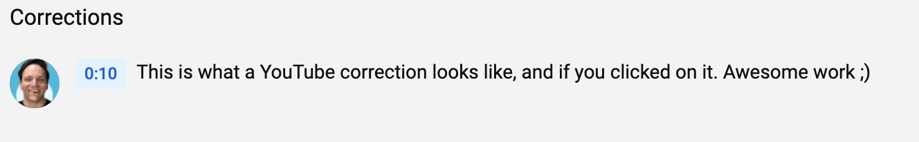 The correction card appears as a standard YouTube info card inside the player, in the same visual style creators already use for linked videos, playlists, and channel mentions. When a viewer clicks the card, a side panel opens on the right of the video with your list of corrections, and each entry is timestamped so viewers can jump to the exact moment the correction refers to. The same list is also visible in the video description below the player, which gives viewers a second surface to catch the correction if they never click the in-player card.